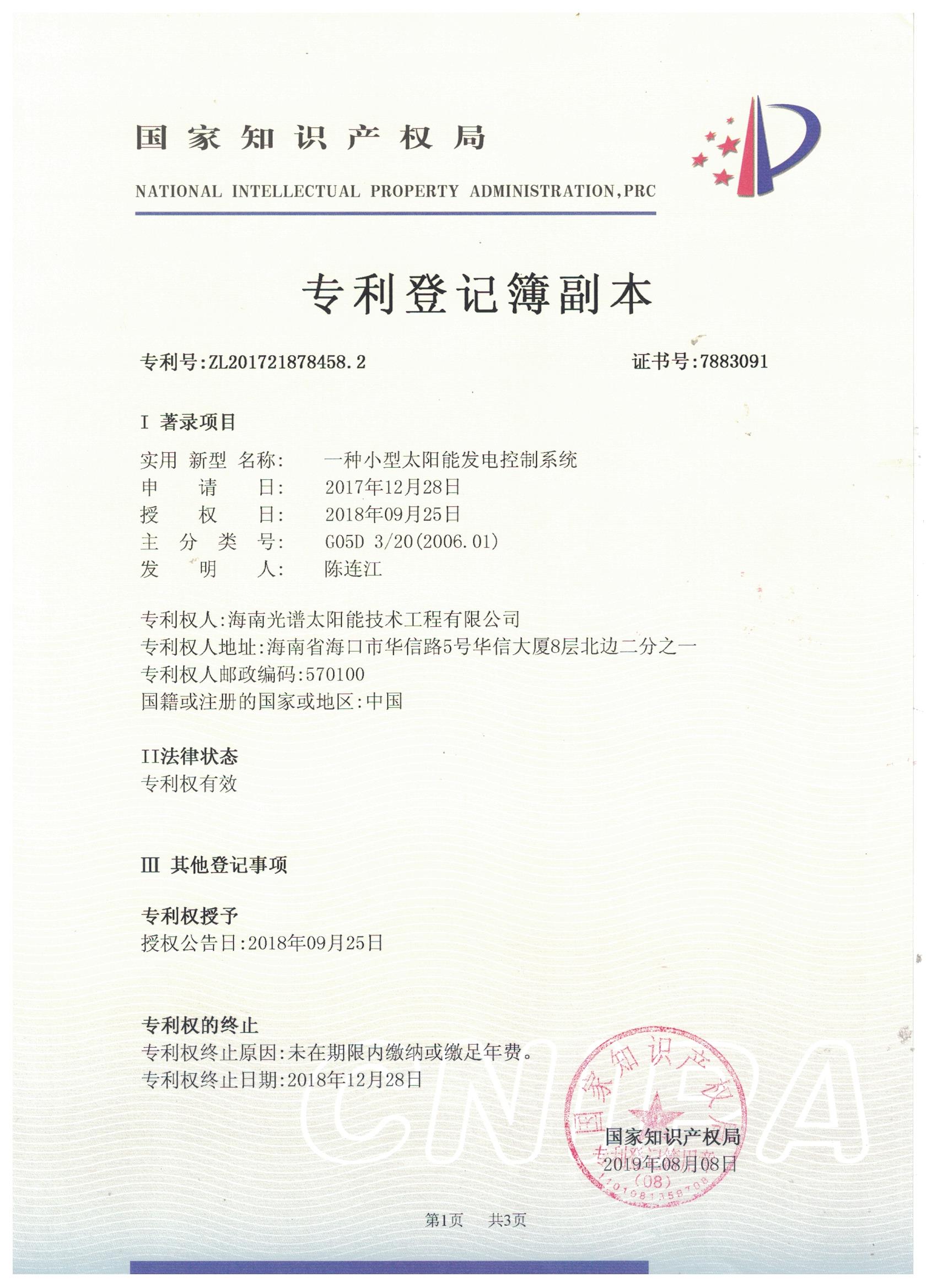 近日,我司申報的“一種太陽能熱泵蒸汽發生裝置”發明專利通過審查,獲得國家知識產權局授予的發明專利證書,授權專利號為“ZL201911126309.4”。 此次獲得國家頒發的專利證書,是對海南光譜公司創新實力的認可,代表著我司知識產權取得了突破性進展,為公司的持續性發展提供強有力的科技創...